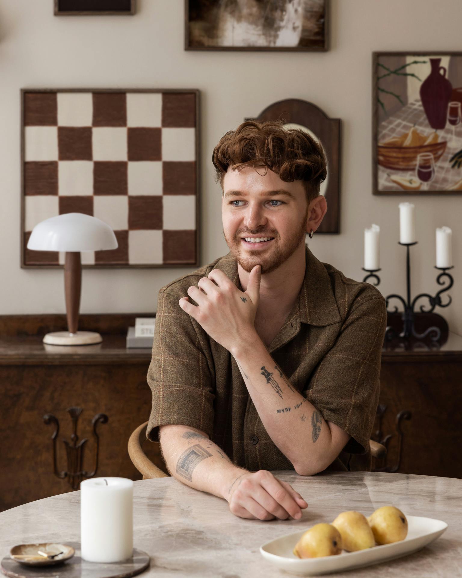 Drew Michael Scott conçoit un espace en s'inspirant des affiches Desenio, en choisissant une palette de couleurs et un style basé sur un mur d'exposition Desenio.
