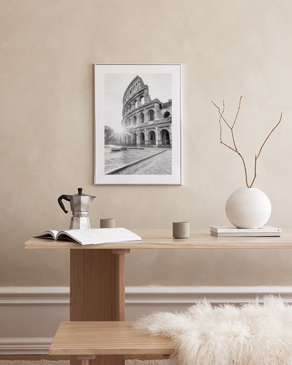 Photographie en noir et blanc du Colisée de Rome, avec le soleil qui brille à l’arrière-plan. Prolongez vos souvenirs de voyage préférés avec des affiches de vos villes préférées.