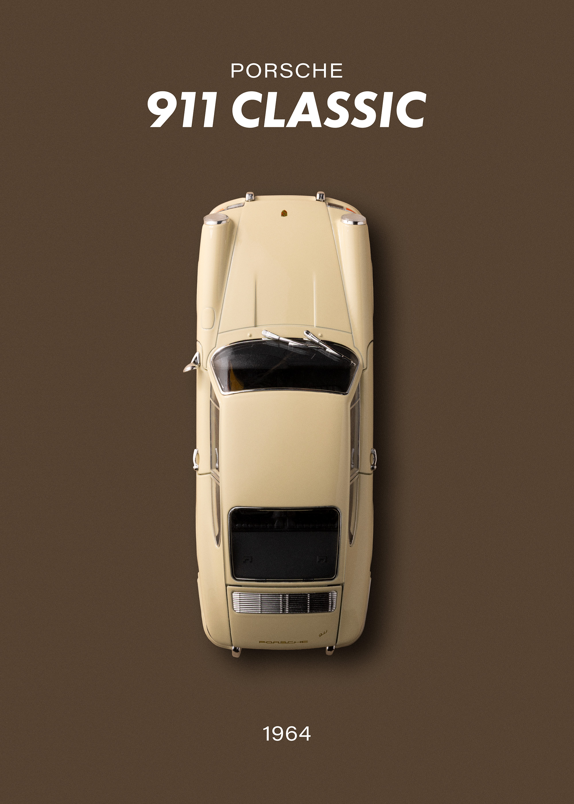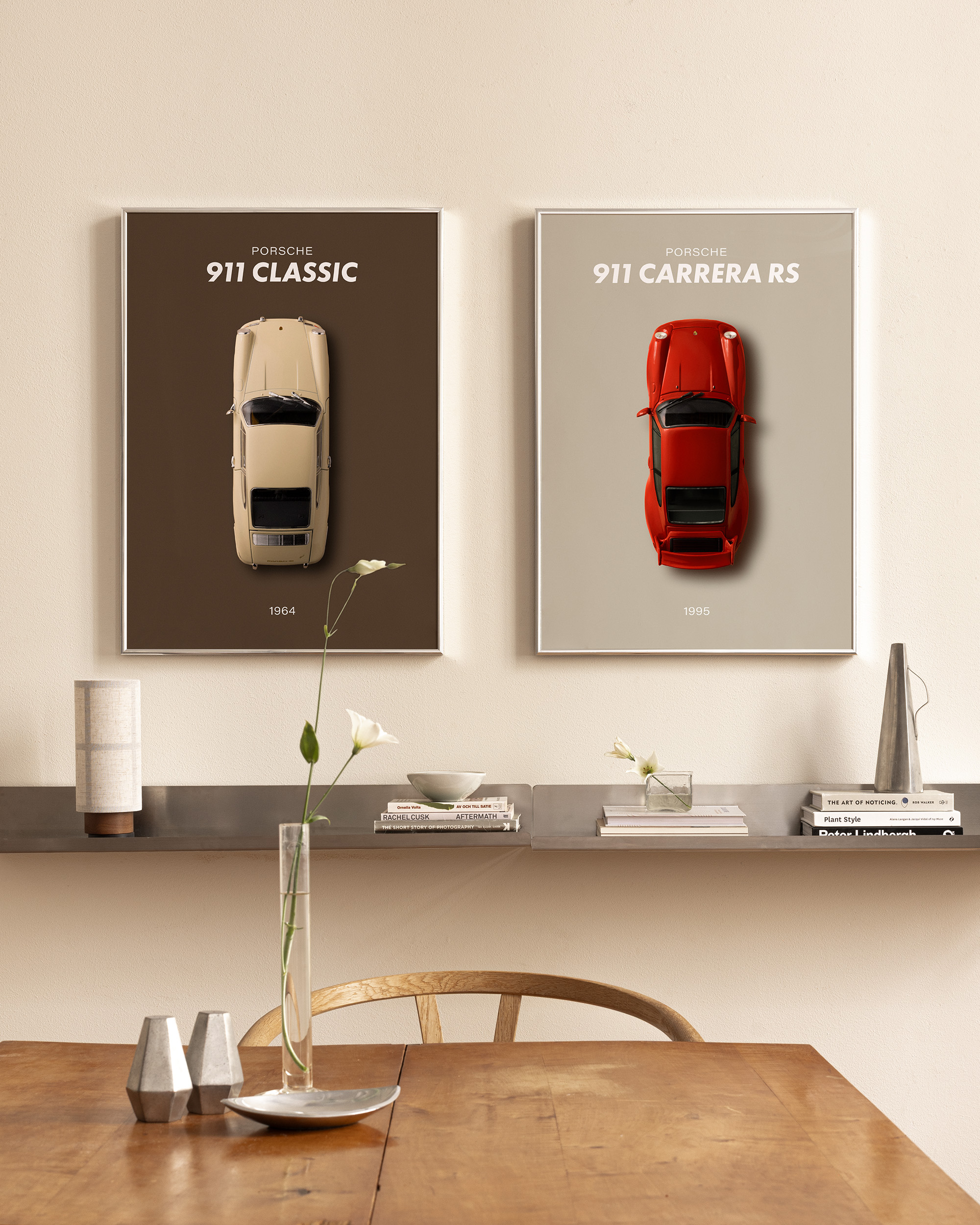Deux affiches de voitures Porsche classiques : une 911 Classic beige de 1964 et une 911 Carrera RS rouge de 1995, idéales pour créer une décoration murale élégante pour les amateurs d’automobiles.