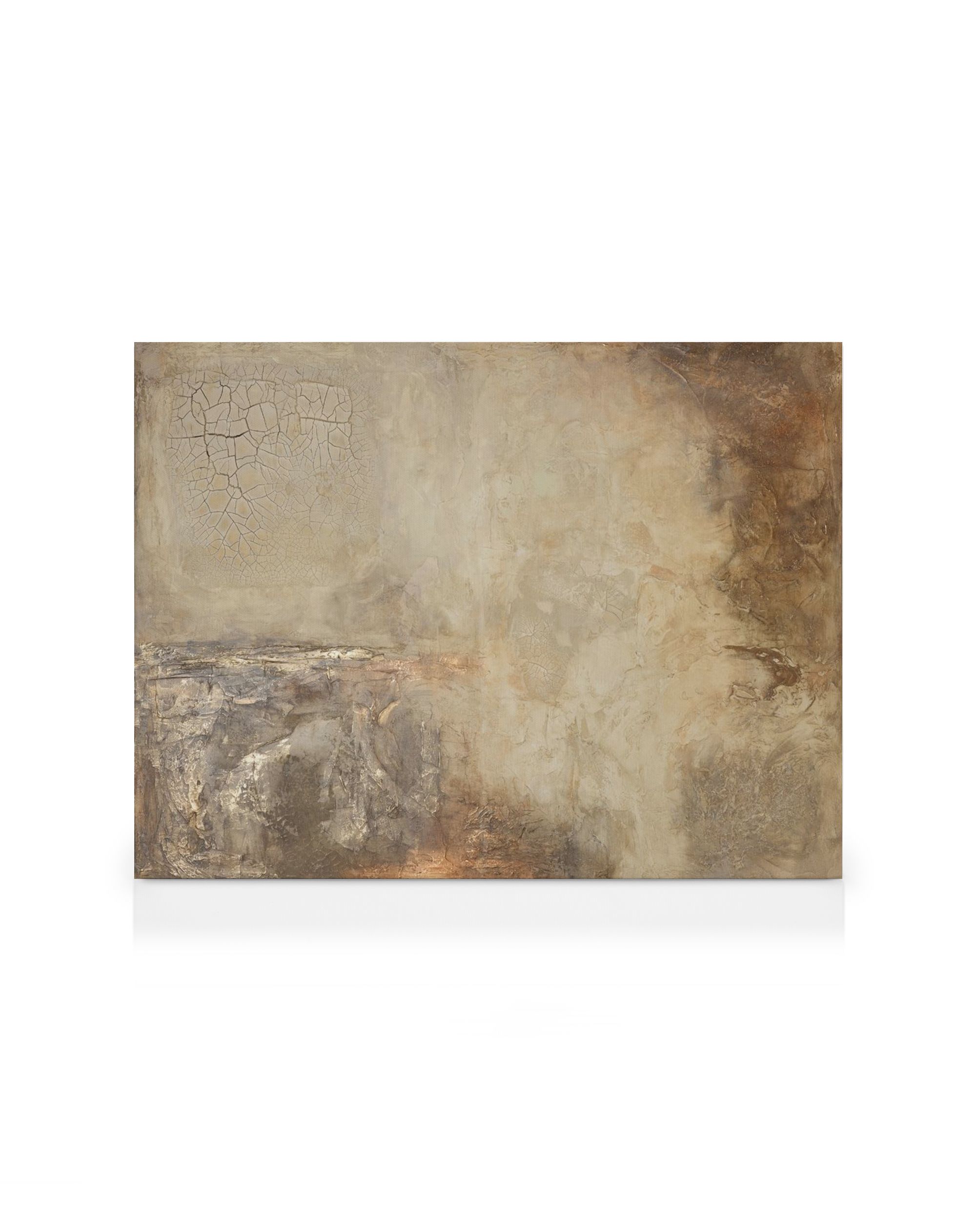 "Cette exploration de l'interaction texturale vous invite à un voyage à travers le temps, où les fissures et les couches usées racontent une histoire de résilience plutôt que de ruine. J'ai utilisé des tons terreux et des reflets métalliques pour créer de la profondeur et évoquer un sentiment de beauté naturellement patinée", dit l'artiste.