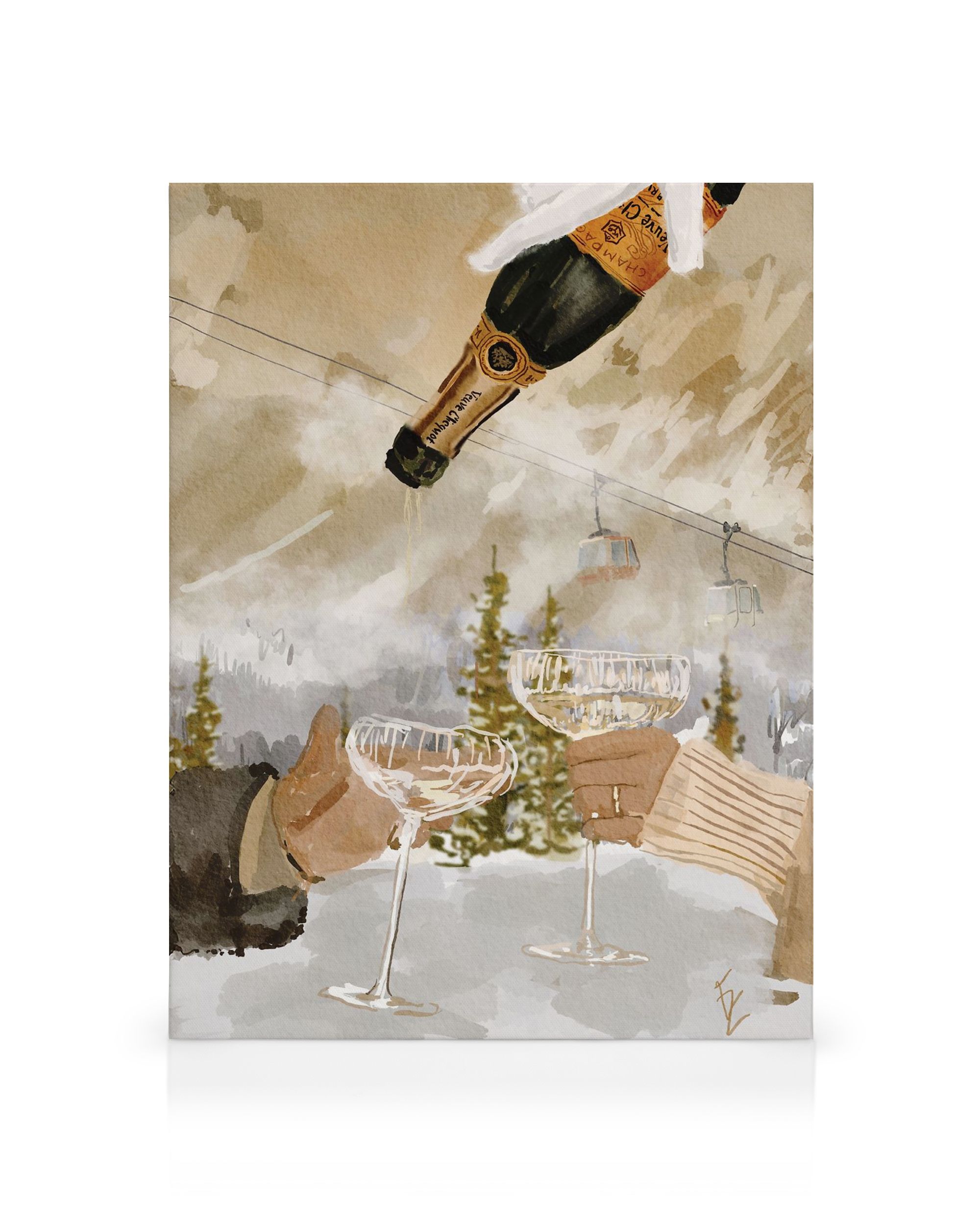 À partir de $53.95Une toile festive montrant deux mains tenant des flûtes de champagne avec une scène hivernale enneigée en arrière-plan présentant des remontées mécaniques et des téléphériques dans des tons chauds de brun et de blanc.