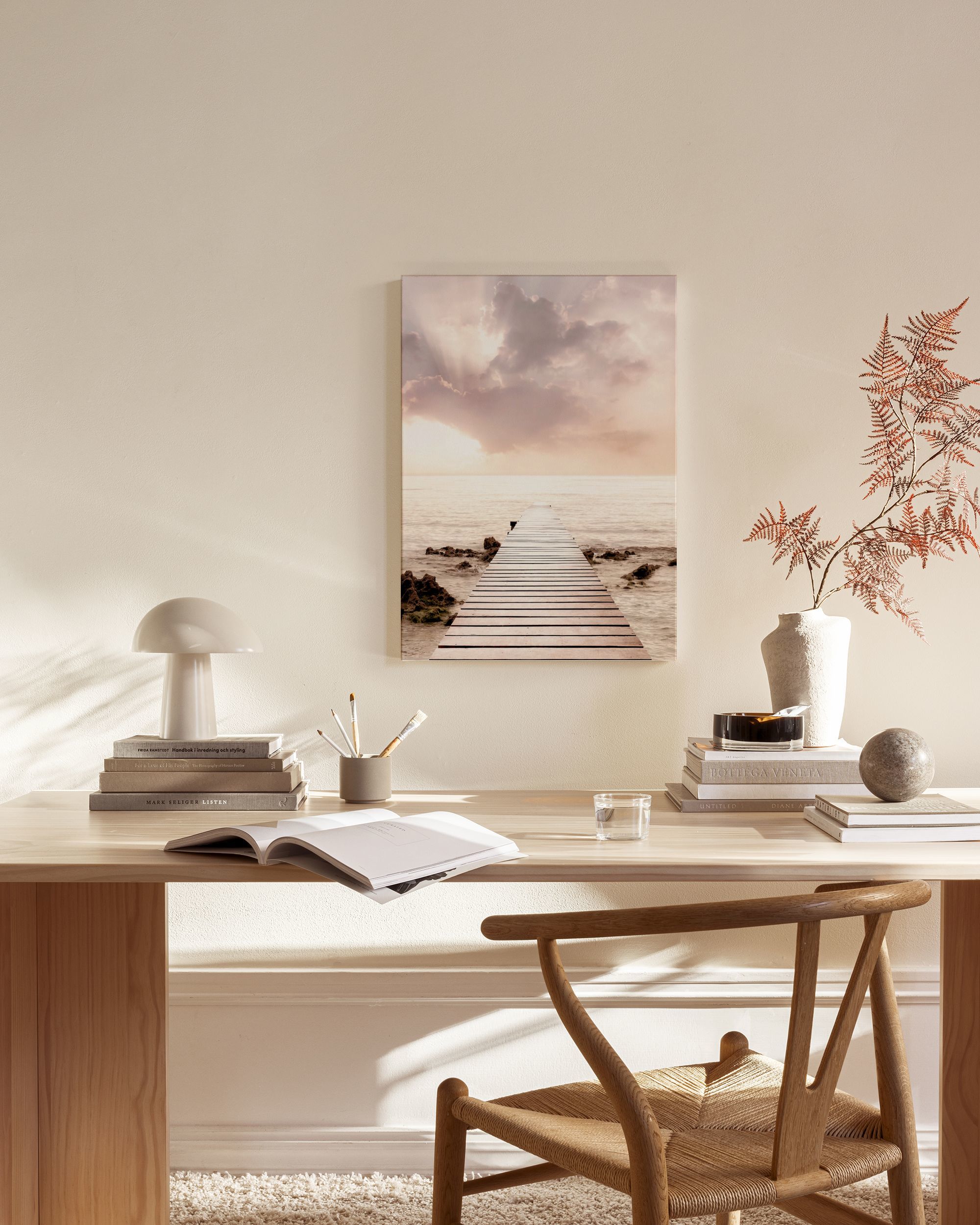 À partir de $53.95Une toile montrant un quai en bois s'étendant dans la mer au coucher du soleil, avec la lumière du soleil traversant de grands nuages roses, blancs et bleus. La décoration murale parfaite pour créer une ambiance calme et relaxante dans votre maison.
