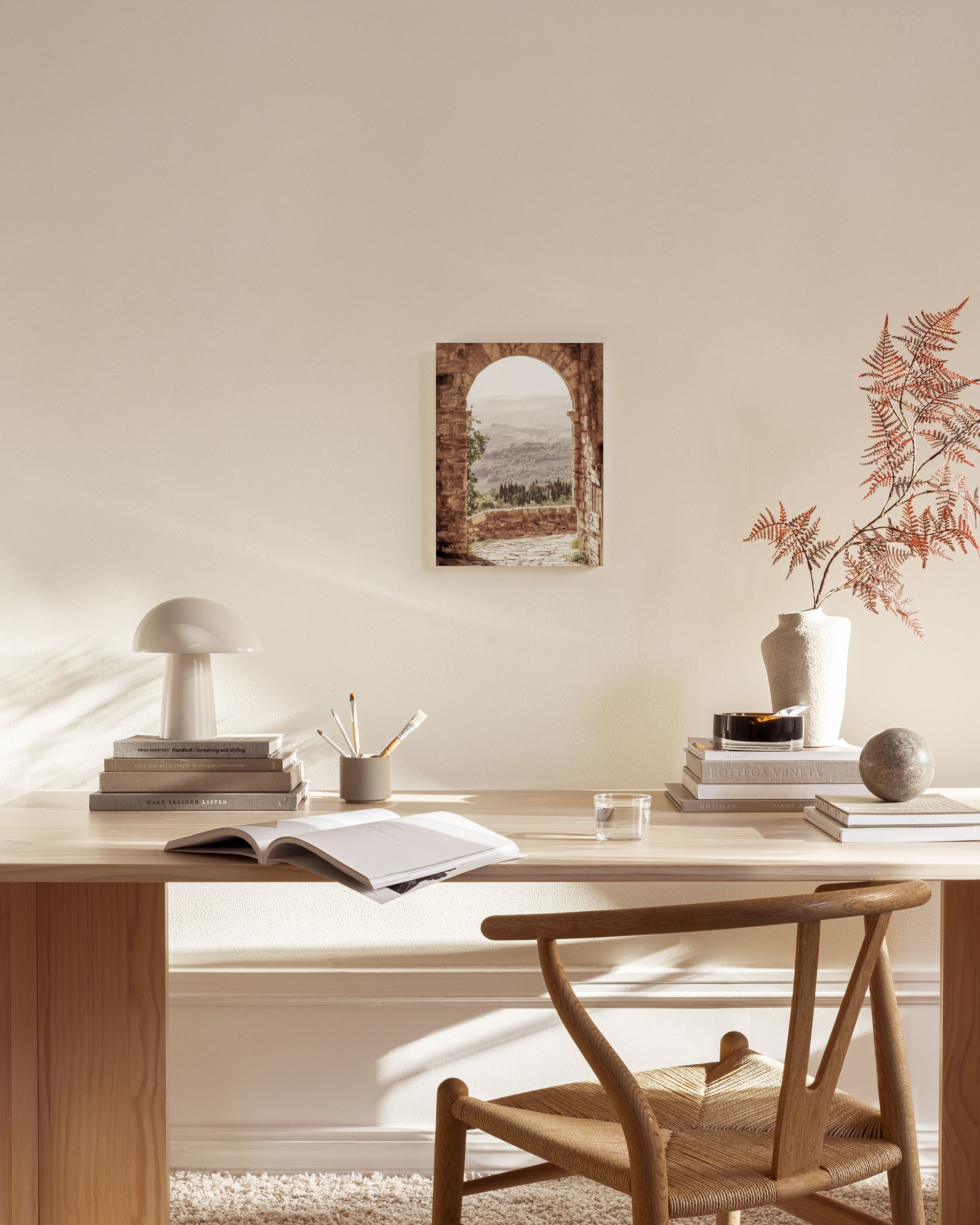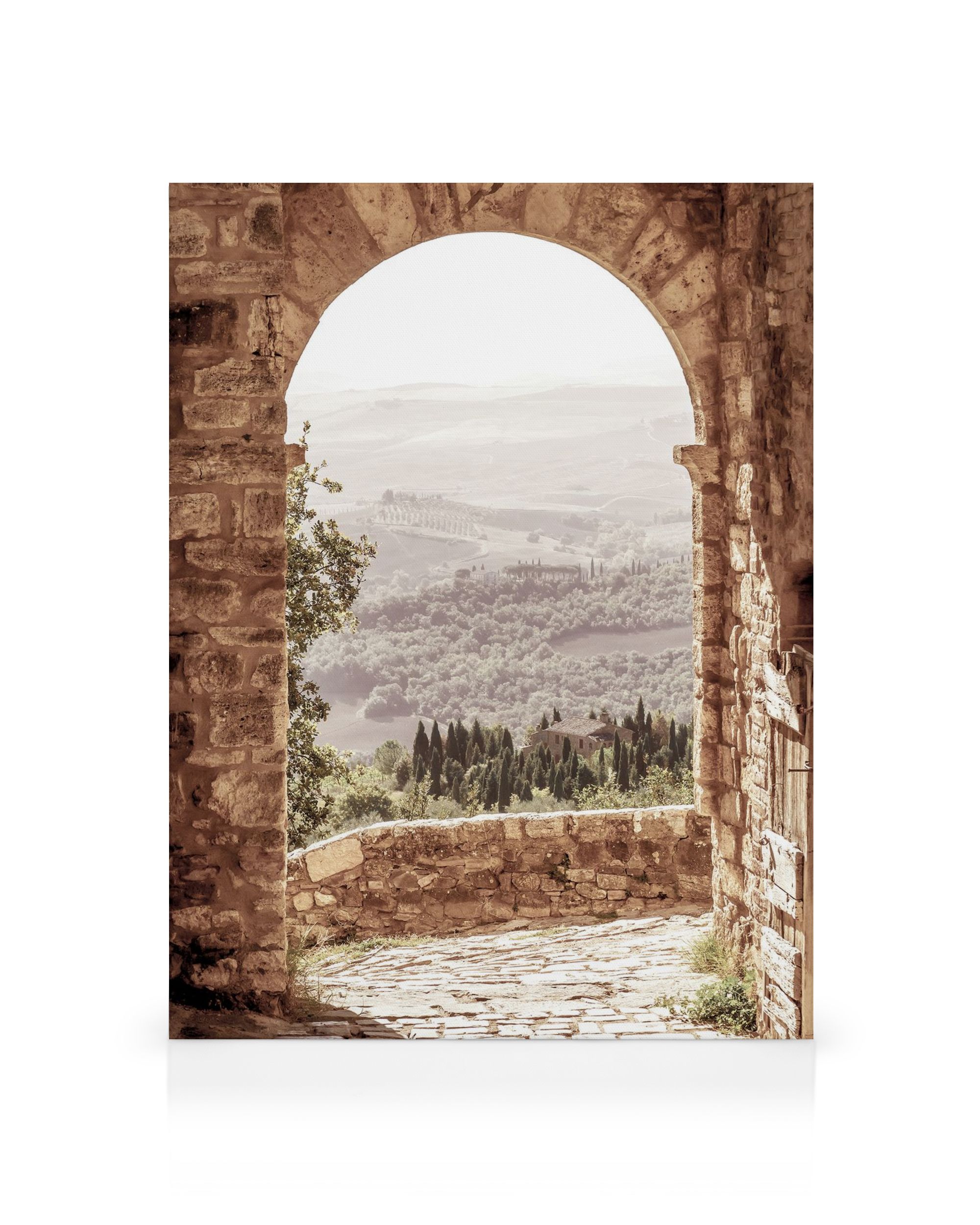 À partir de $53.95Une toile représentant une arche en briques brunes, menant à un chemin de pierre et des collines ondulantes avec des arbres et des champs. Couleurs douces et chaudes, y compris le brun, le beige et le vert.