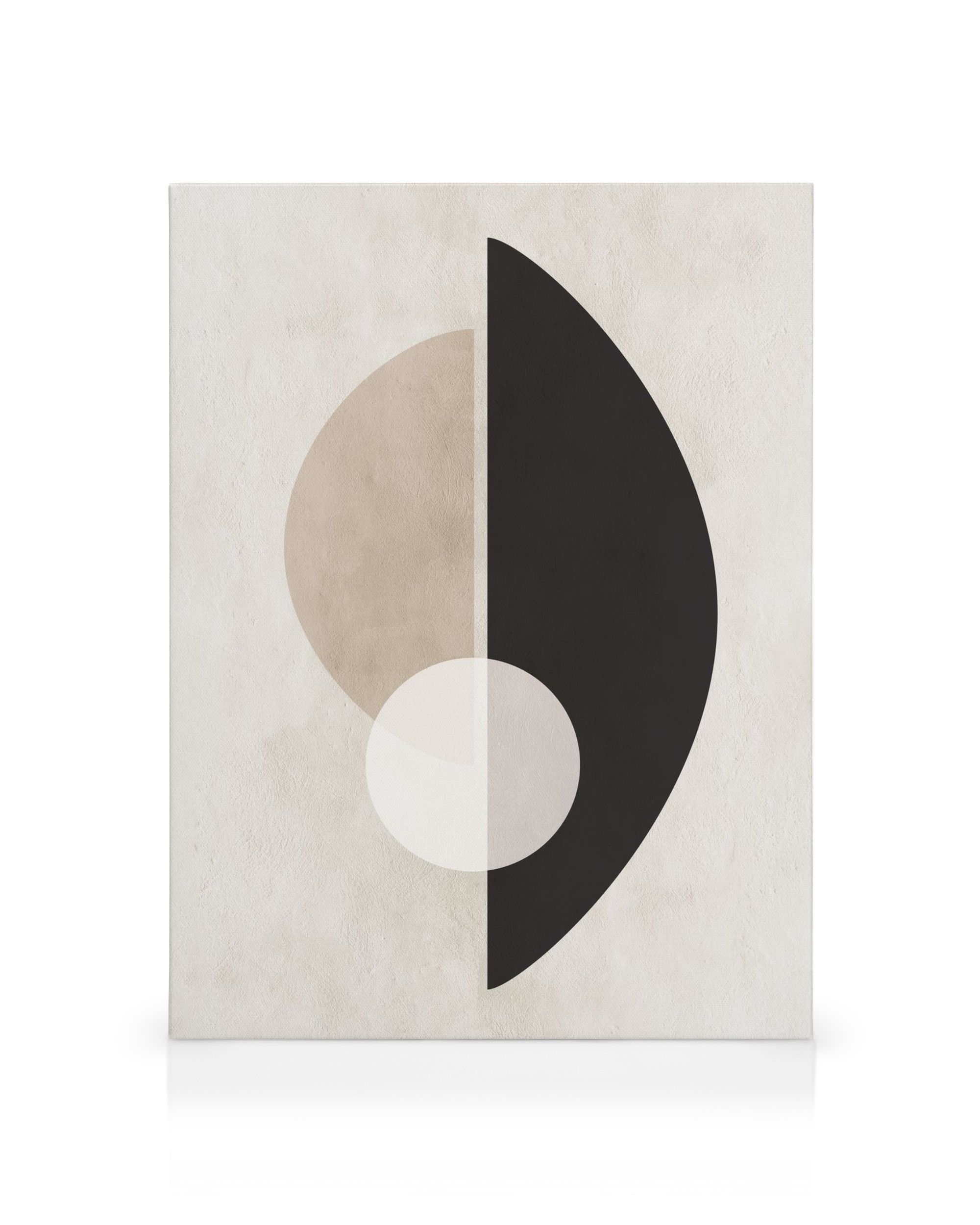 A two-panel canvas print with abstract shapes. Beige and tan circles on the left, black semi-circle on the right. The circles overlap for continuity.