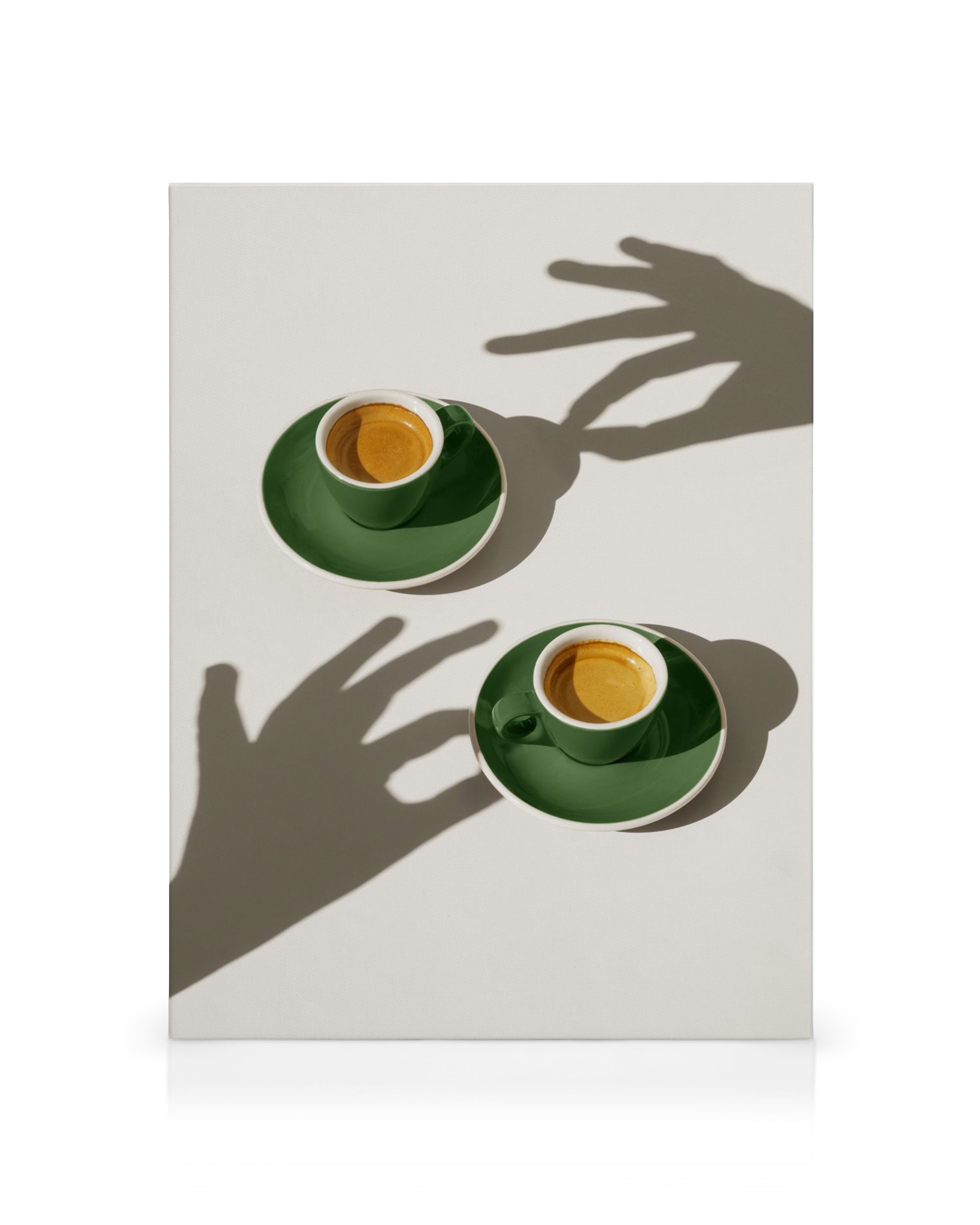Two green coffee cups on matching saucers with interesting hand shadows. Perfect canvas to brighten up your kitchen or dining room.