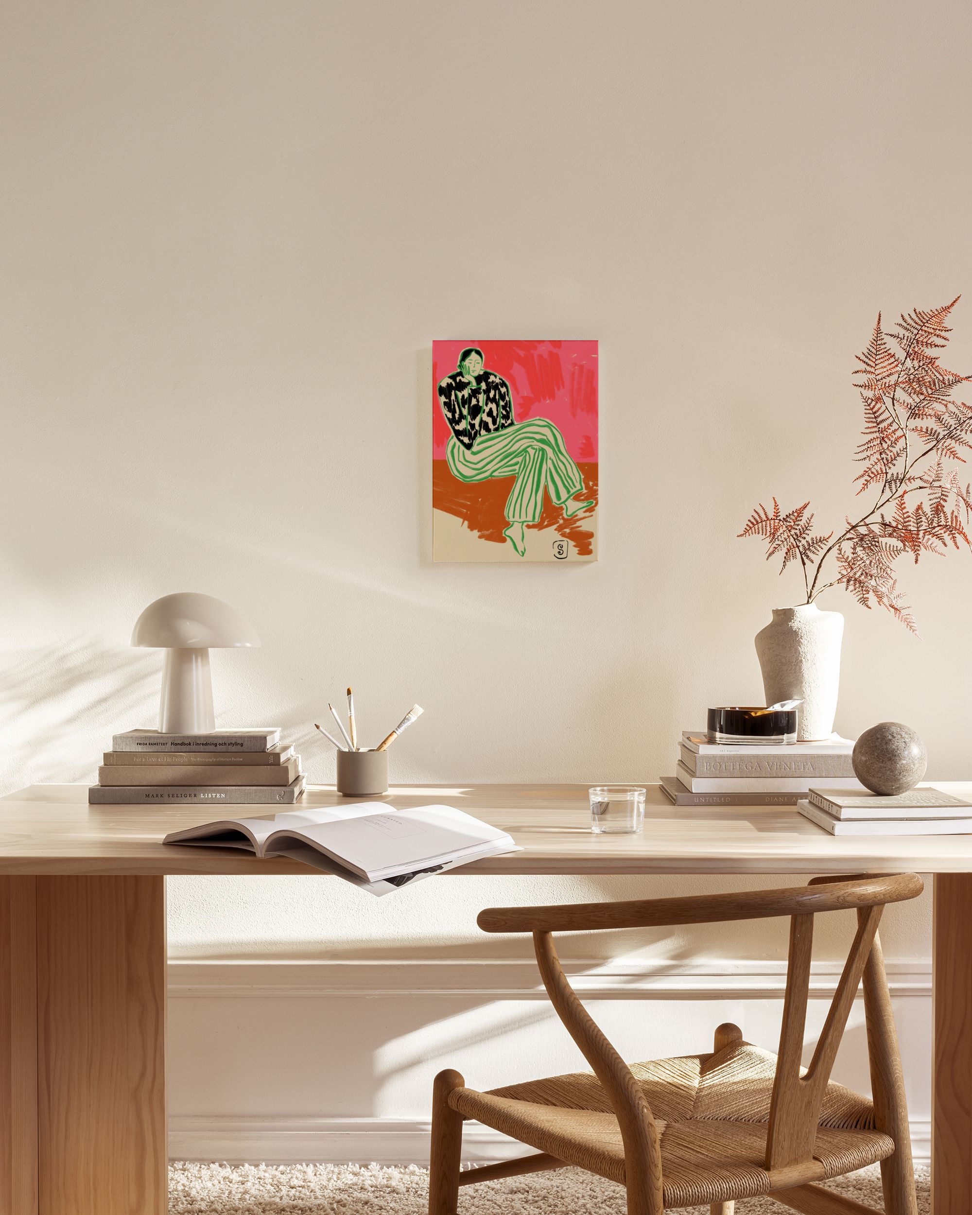 From $32.37A person sitting, wearing a patterned top and striped pants. The background is pink and brown. Simple lines and bright colours make this canvas print vibrant and eye-catching.